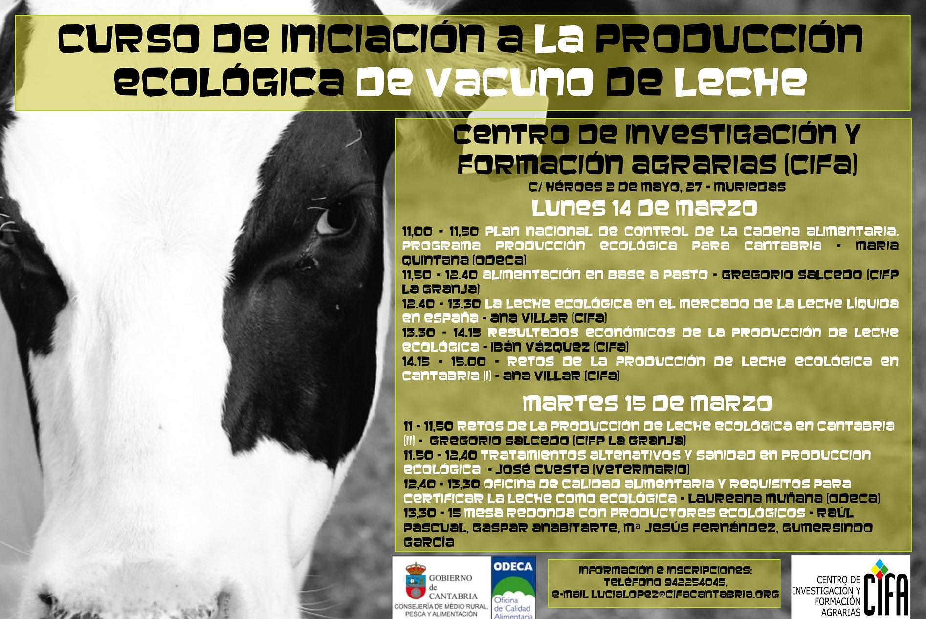 Los días 14 y 15 de marzo tendrá lugar en el CIFA el “Curso de iniciación a la producción ecológica de vacuno de leche”, destinado especialmente a ganaderos con interés en conocer las características de la producción ecológica en vacuno de leche. El curso, que se impartirá en horario de 11 a 15h ambos días, requiere inscripción previa llamando al teléfono 942 25 40 45 ó en la dirección de correo electrónico lucialopez@cifacantabria.org. El programa está disponible en el siguiente enlace.